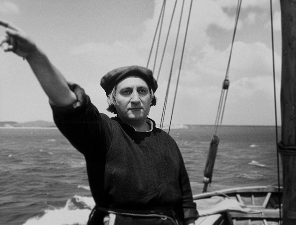 Embarcado en la Santa María, Cristóbal Colón es avisado por Rodrigo de Triana de que han avistado tierra. Sale a cubierta y da indicaciones a los marineros para acercarse a la costa, si bien no está claro si para esta foto el almirante estaba posando. El retrato guarda cierto parecido con su representación idealizada en el puerto de Barcelona.